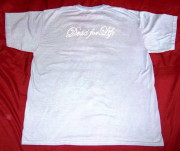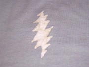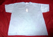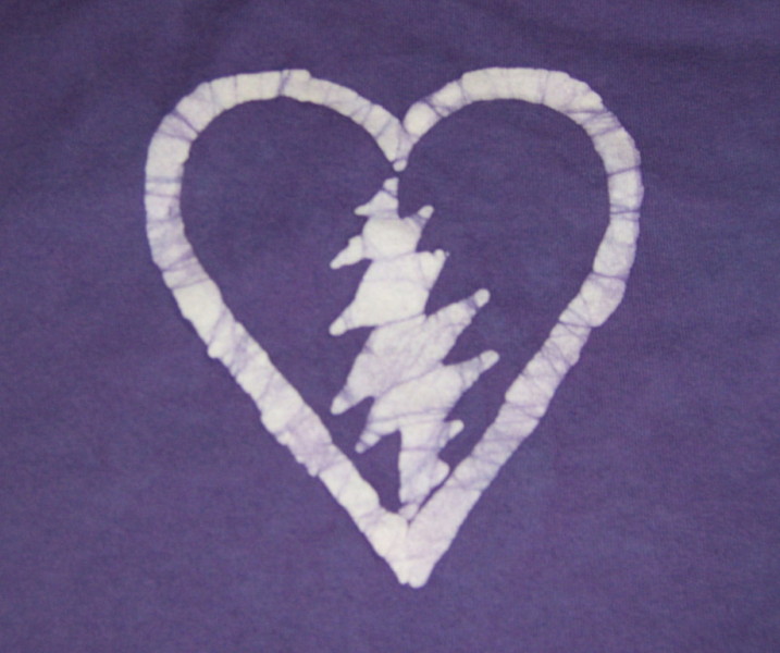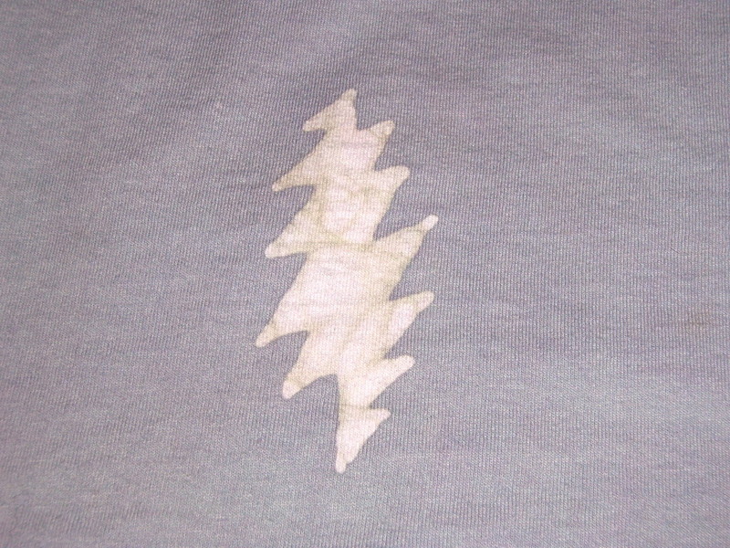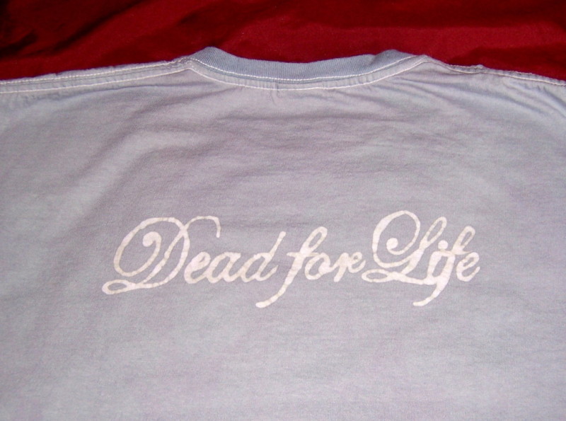 Batik T-shirt. Front: 13-point lightning bolt. Back: "Dead for Life" in Edwardian script. Steel blue. Only available in XL.